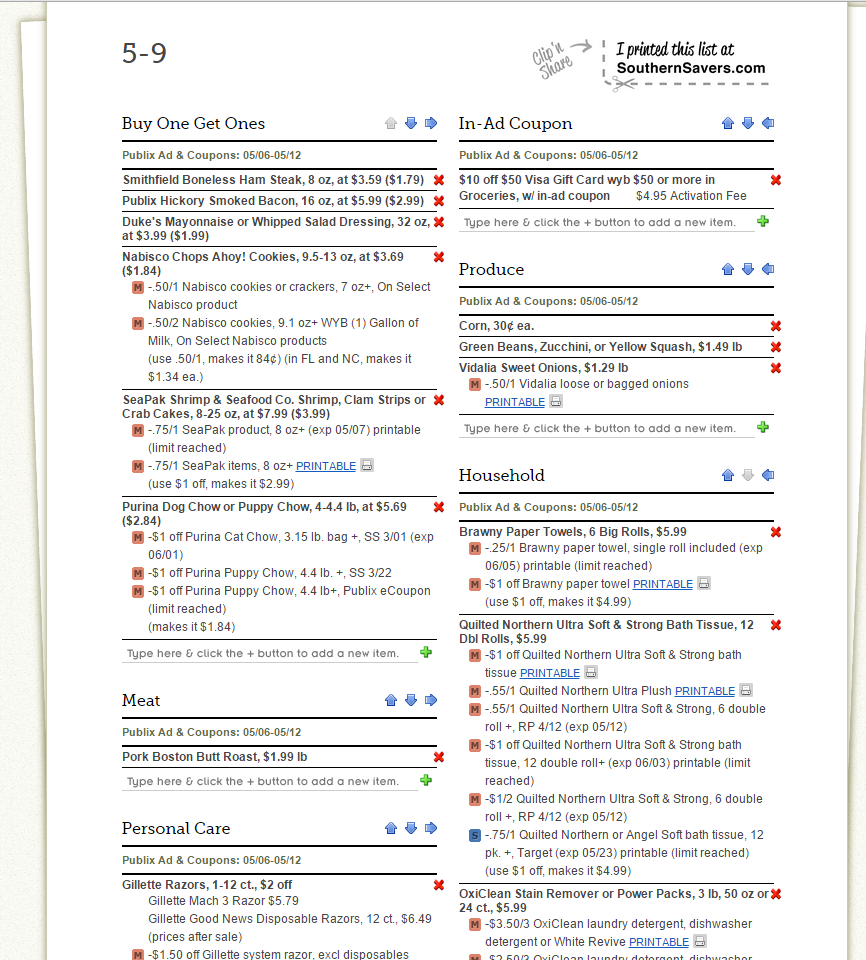 Okay, so you have the shopping list created with your selected items, as in my picture example shown. Now click on the coupon links to print them, find the coupons in your newspaper inserts and “clip” any digital coupons noted on your list.